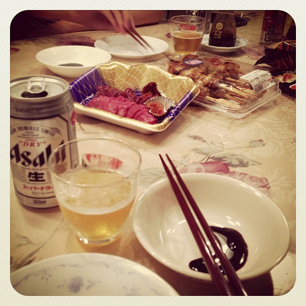 焼き鳥と馬刺しとビールと。